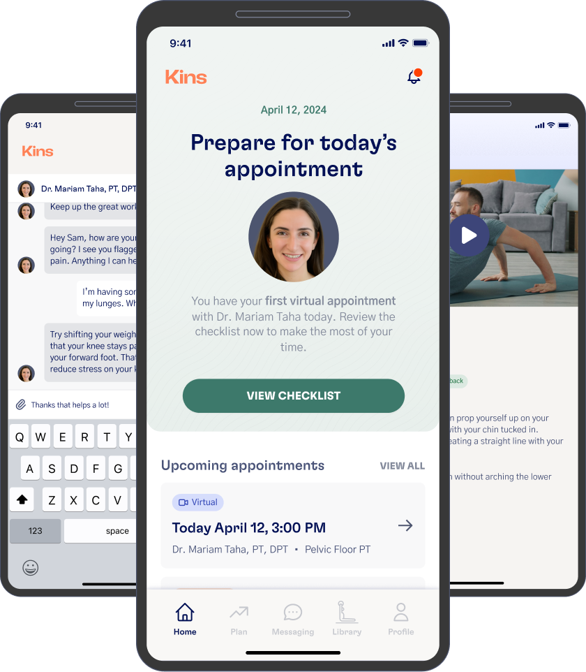 Enter your state and insurance details. If you’re eligible, we’ll match you with a trusted Kins PT and you can book a time that fits your routine.